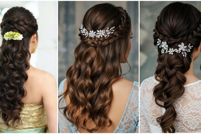 This half-up braided hairstyle features soft flowing waves and a crystal tiara accessory. A dreamy choice for bridesmaids and brides, it suits gowns, lehengas, and modern wedding celebrations.